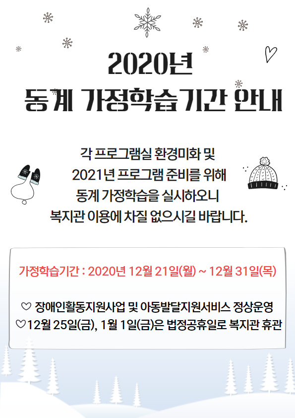 동계 가정학습을 실시하오니 복지관 이용에 차질 없으시길 바랍니다.