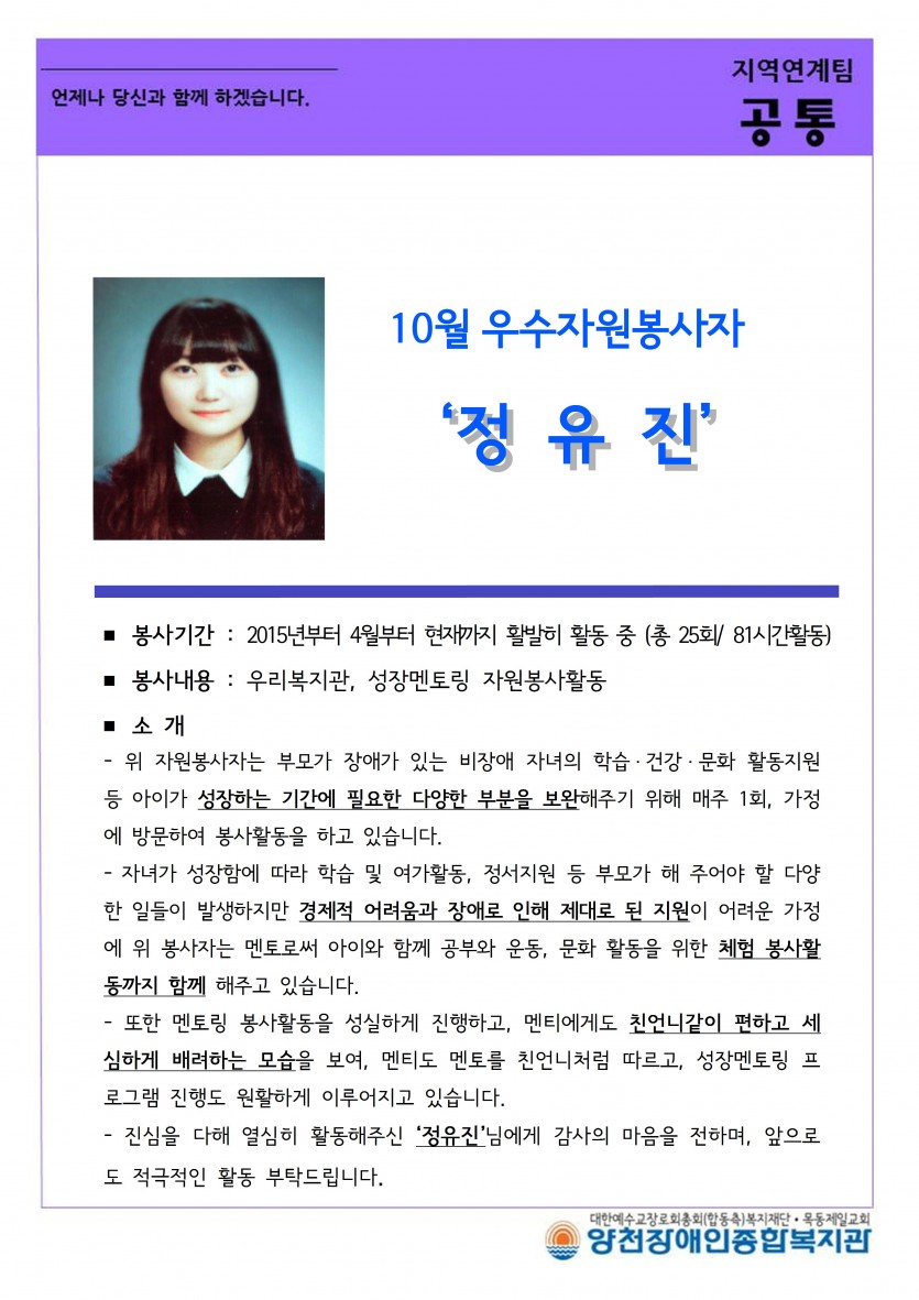 10월의 우수자원봉사자 '정유진'님