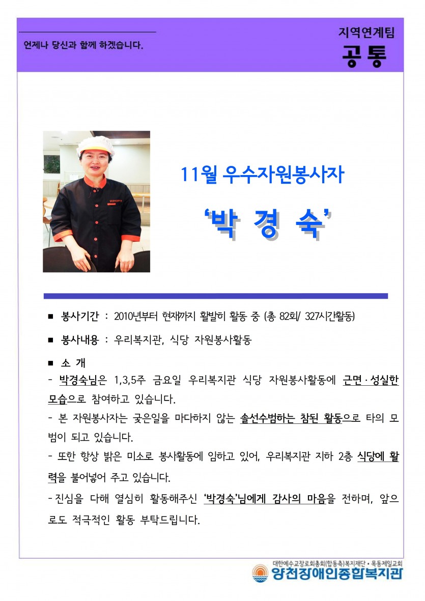 - 박경숙님은 1,3,5주 금요일 우리복지관 식당 자원봉사활동에 근면·성실한 모습으로 참여하고 있습니다.