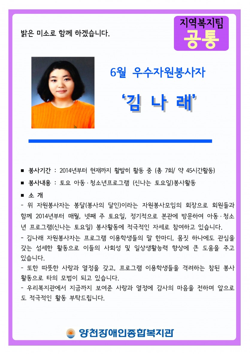 - 김나래 자원봉사자는 프로그램 이용학생들의 말 한마디, 몸짓 하나에도 관심을 갖는 섬세한 활동으로 이들의 사회성 및 일상생활능력 향상에 큰 도움을 주고 있습니다.
