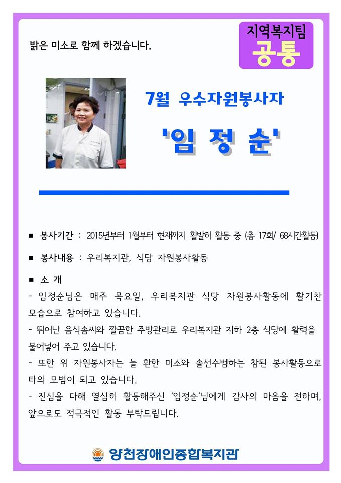 - 진심을 다해 열심히 활동해주신 ‘임정순’님에게 감사의 마음을 전하며, 앞으로도 적극적인 활동 부탁드립니다.