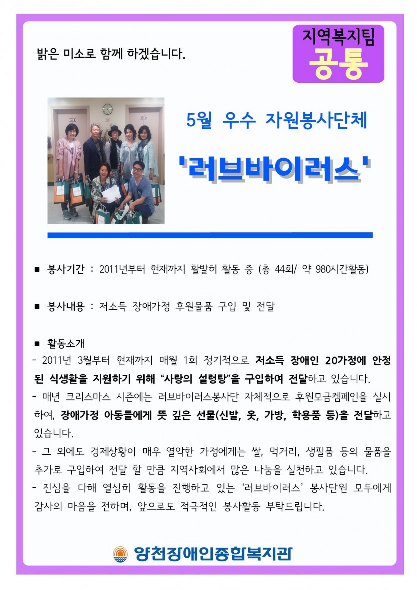 - 위 자원봉사단체는 2011년 3월부터 현재까지 매월 1회 정기적으로 저소득 장애인 20가정에 안정된 식생활을 지원하기 위해 “사랑의 설렁탕”을 구입하여 전달하고 있습니다.