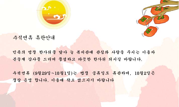 추석연휴 (9월29일~10월1일)는 법정 공휴일로 휴관하며, 10월2일은 정상 운영 합니다. 이용에 착오 없으시기 바랍니다
