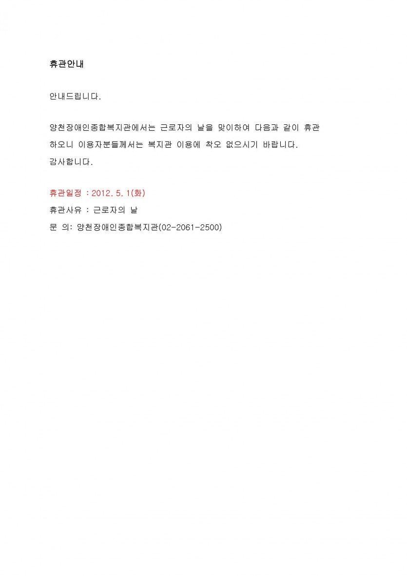 양천장애인종합복지관에서는 근로자의 날을 맞이하여 다음과 같이 휴관