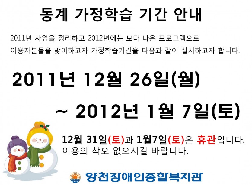 2011년 사업을 정리하고 2012년에는 보다 나은 프로그램으로 이용자분들을 맞이하고자 가정학습기간을 다음과 같이 실시하고자 합니다.