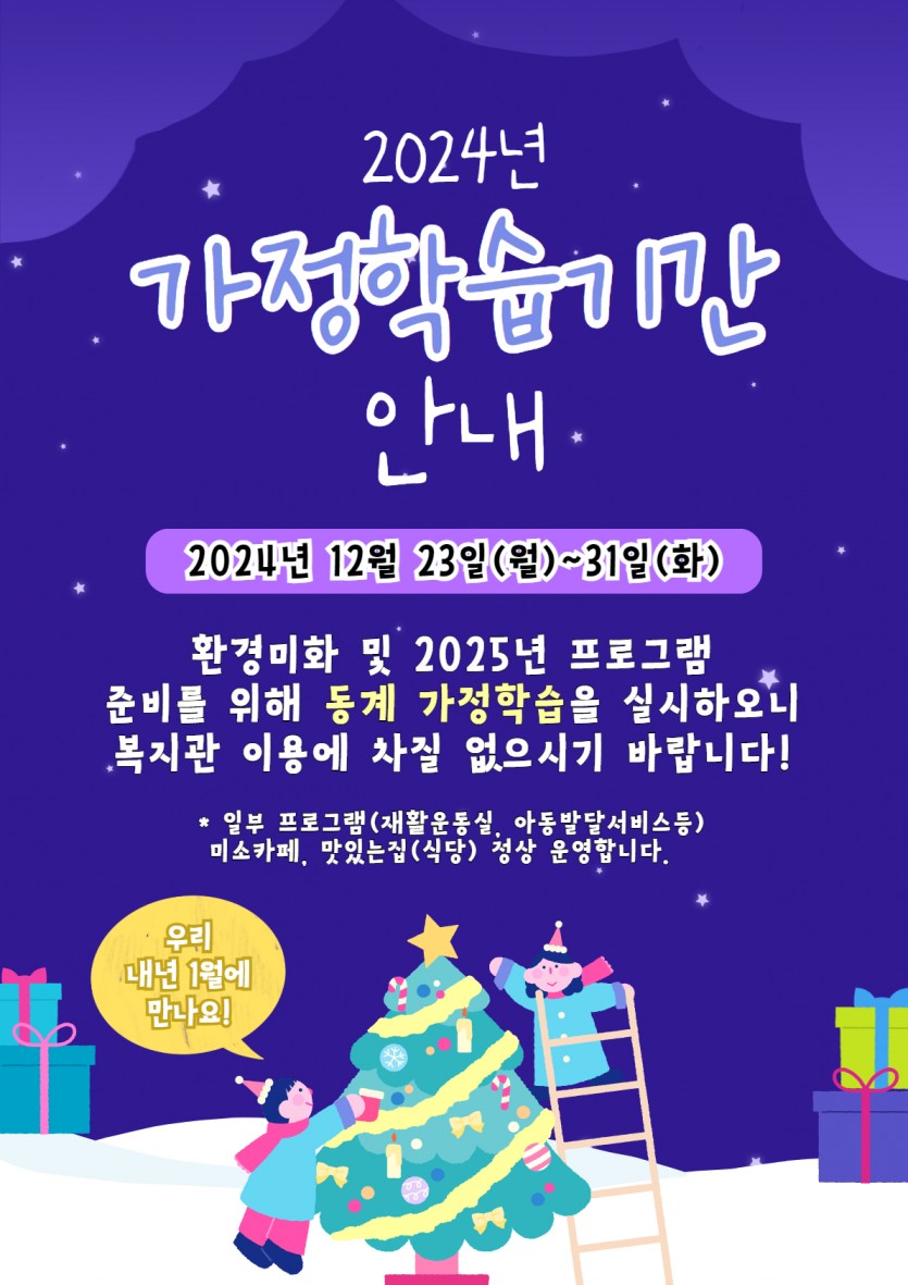 환경미화 및 2025년 프로그램 준비를 위해 동계 가정학습을 실시하오니 복지관 이용에 차질 없으시기 바랍니다!