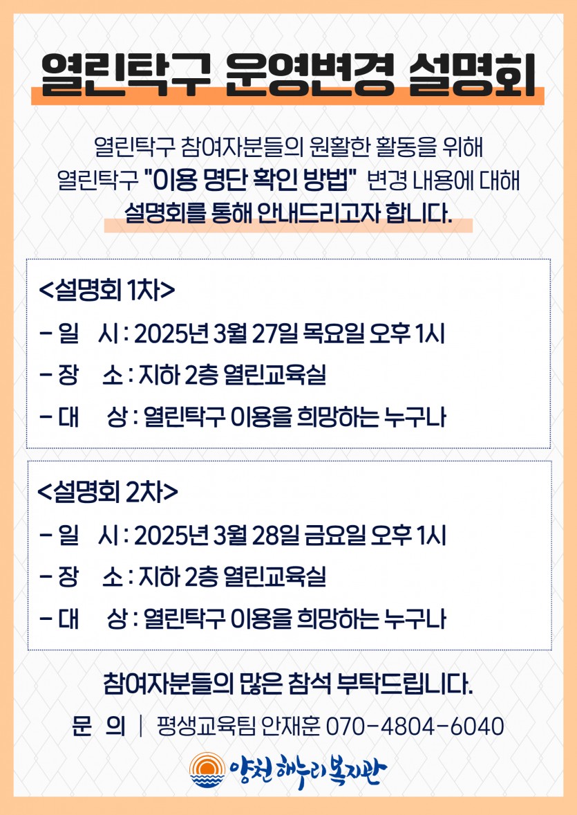 열린탁구 참여자분들의 원활한 활동을 위해 열린탁구 "이용명단 확인방법" 변경 내용을 설명회를 통해 안내드리고자 합니다.
