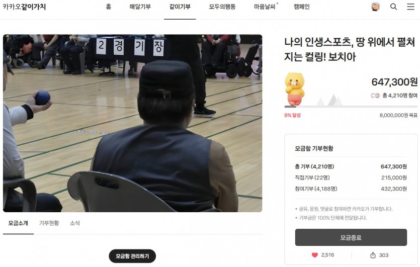 제7회 해누리보치아대회의 성공적인 개최를 위해 카카오 같이가치를 통해 개설되었던 모금함!