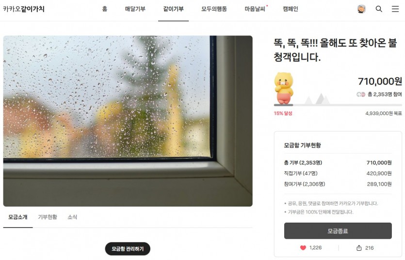 집수리를 위한 기금 마련을 위해 카카오 같이가치에서 4월 10일부터 5월 10일까지 30일간 함께해주신 2,353명의 기부자분들 덕분에 710,000원이라는 소중한 기부금이 모였습니다.