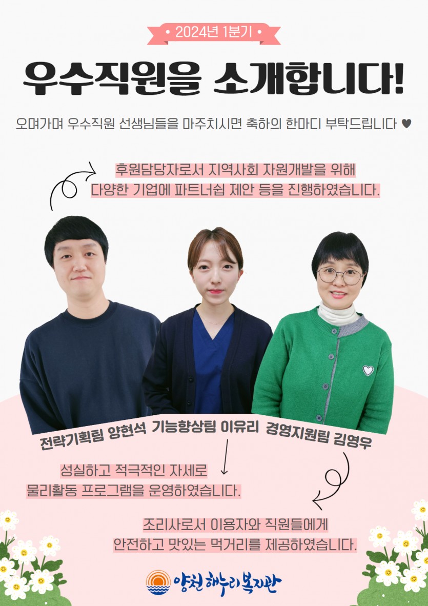 2024년 1분기 우수직원을 함께 축하해 주세요! 페이지 정보 작성자 최고관리자 댓글 0건 조회 745회 작성일 24-04-02 15:52 목록 본문 양천해누리복지관 2024년 1분기 우수직원을 소개합니다!전략기획팀 양현석, 기능향상팀 이유리, 경영지원팀 김영우 선생님모두 축하드립니다 :) 목록 이전글 복지관 휴관 안내 24.04.03 다음글 재활운동실 이용 안내 24.03.19 댓글 0 댓글목록 등록된 댓글이 없습니다.