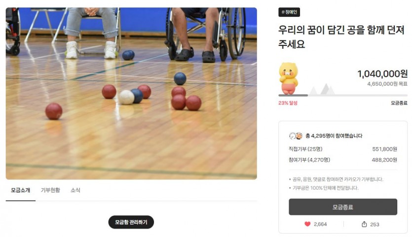 제6회 해누리보치아대회 개최를 위해 1월 11일부터 4월 7일까지 약 80여일간 개설되었던 카카오 같이가치 모금함!