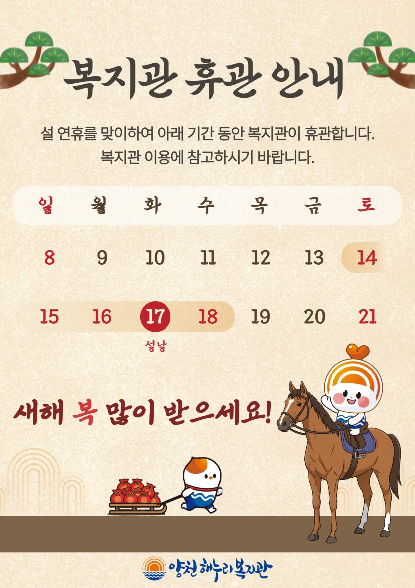 법정공휴일인 설 명절을 맞이하여 복지관이 휴관합니다.