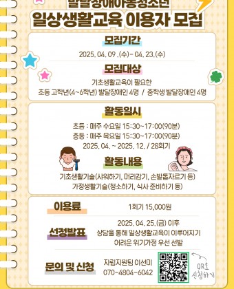 기초생활교육이 필요한 초등 고학년(4~6학년) 발달장애인, 중학생 발달장애인