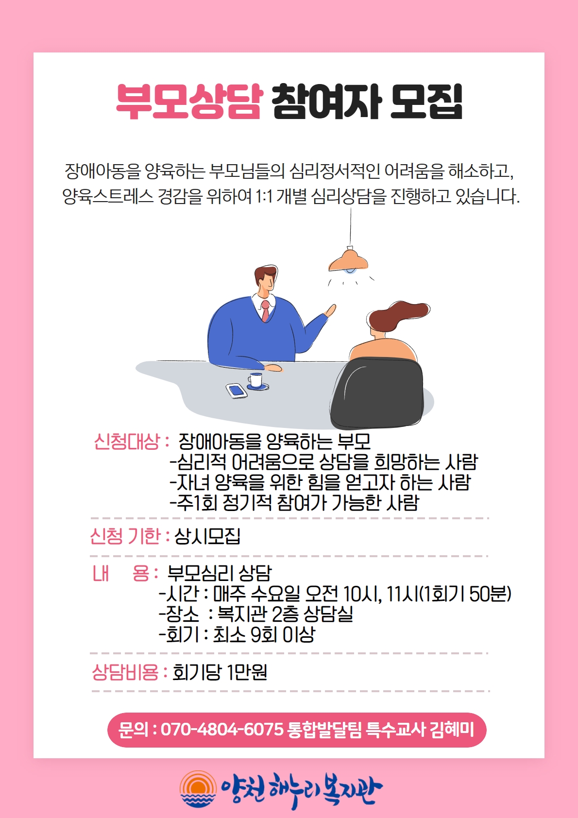 장애아동을 양육하는 부모님들의 심리정서적인 어려움을 해소하고, 양육스트레스 경감을 위해 1:1 개별 심리상담을 진행하고 있습니다.